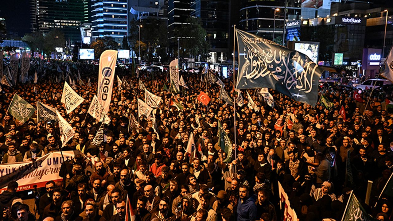Ellerinde Kelime-i Tevhid yazılı bayrak ile Filistin bayrağı taşıyan gruptakiler, sık sık tekbir getirdi.
