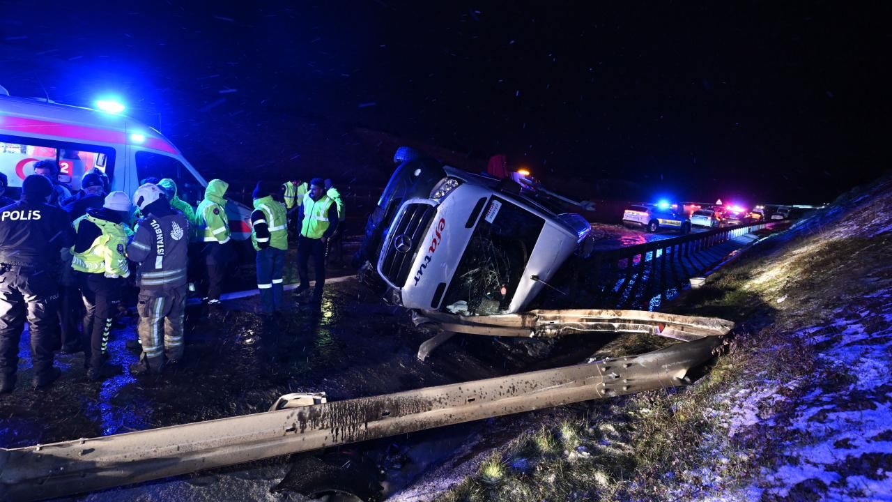 Kuzey Çevre Otoyolu Boğazköy İstiklal mevkisinde İstanbul Havalimanı istikametine seyir halindeki F.S. idaresindeki servis minibüsü kar yağışı sonrası kayganlaşan yolda kontrolden çıkıp bariyerlere çarparak devrildi.