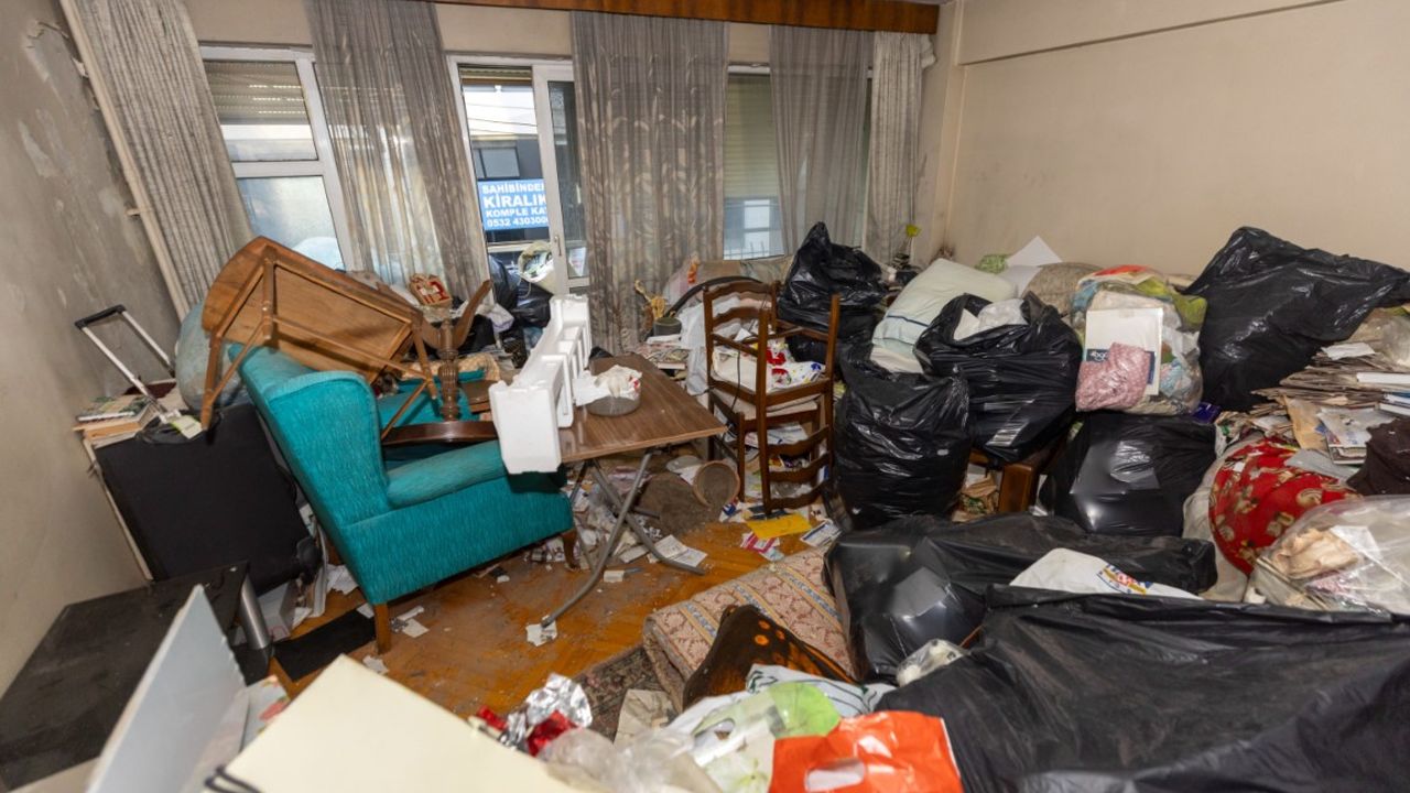 Daireden 4 kamyon dolusu atık eşya ve çöp çıkarıldı, daha sonra evde temizlik çalışması yapıldı.