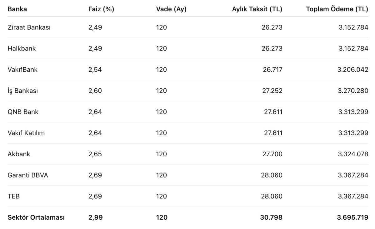 Konut kredisi faizini yüzde 2,49 seviyesine çeken Ziraat Bankası ve Halkbank üzerinden 120 ay vadeyle kullanılan 1 milyon TL’lik kredi, aylık 26 bin 273 TL taksitle geri ödeniyor. Bu durumda toplam ödeme 3 milyon 152 bin TL’ye geriliyor.
