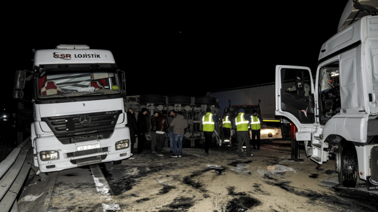 Çarpmanın etkisiyle savrulan tırlardan birinin dorsesi yola devrilirken diğer tır bariyerlere çarparak durdu.
