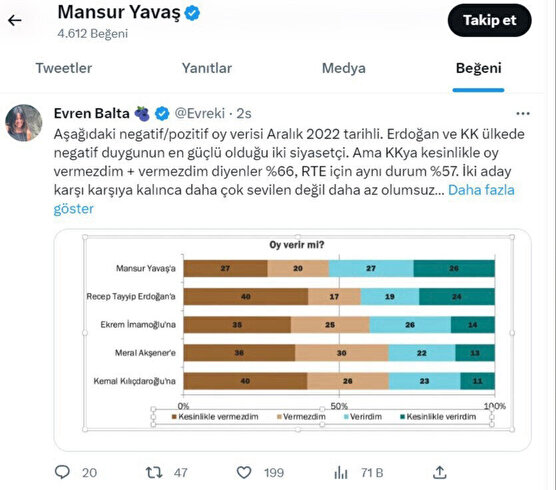 Yavaş, resmi Twitter hesabından Kemal Kılıçdaroğlu’nun negatif duygu uyandıran iki siyasetçiden biri olduğunu gösteren anketi beğendi.