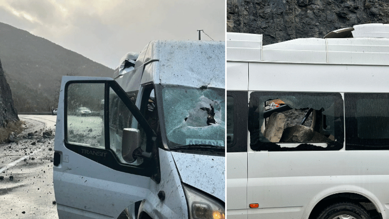 Kaya parçalarının minibüsün tavanını parçalayarak araç içerisine girdiği kazada, minibüste bulunan sürücü ve 2 kişi yaralanmadı.