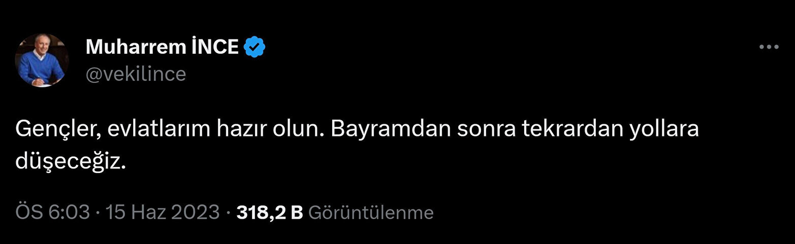 Seçimlerde sessizliğini korumuş tarafsız kalarak siyaset meydanlarından çekilen, Memleket Partisi Genel Başkanı; seçim gündeminin azalması sonrasında teşkilatına mesaj gönderdi. "Gençler, evlatlarım hazır olun." diyen Muharrem İnce, "Bayramdan sonra tekrardan yollara düşeceğiz" dedi.