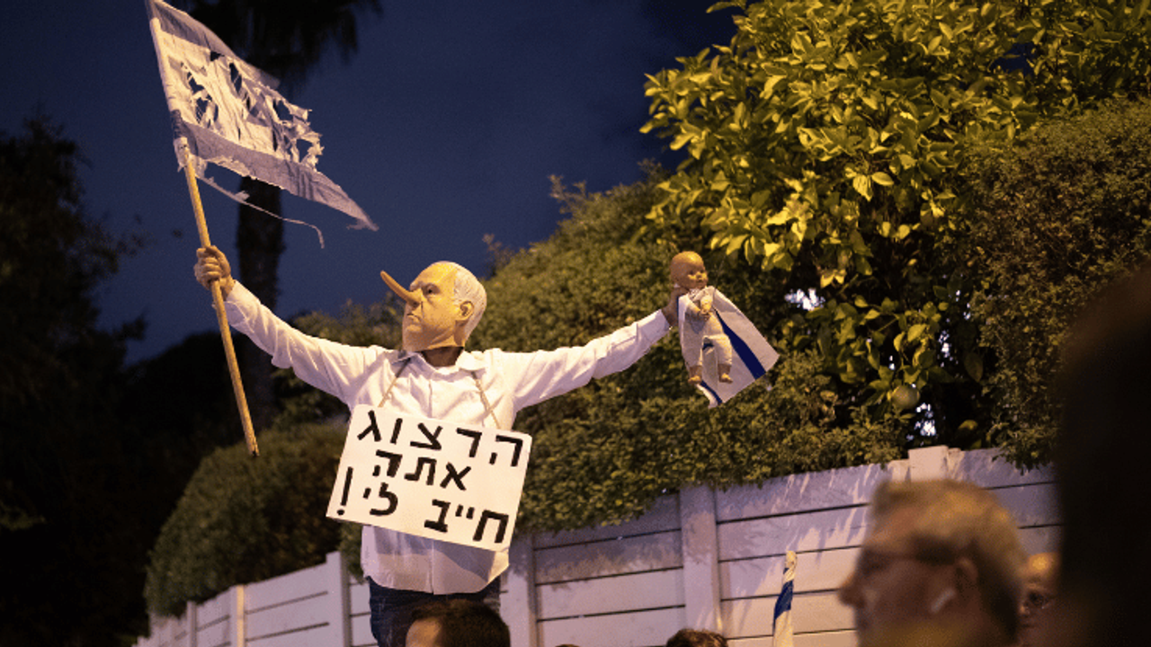 Göstericilerden biri turuncu renkli hapishane tulumu giyerek ve Netanyahu maskesi takarak başbakanı bir diğeri de Herzog maskesi takarak cumhurbaşkanını canlandırdı. Maskeli bu kişiler muz yiyerek "muz cumhuriyetine" gönderme yaptı.