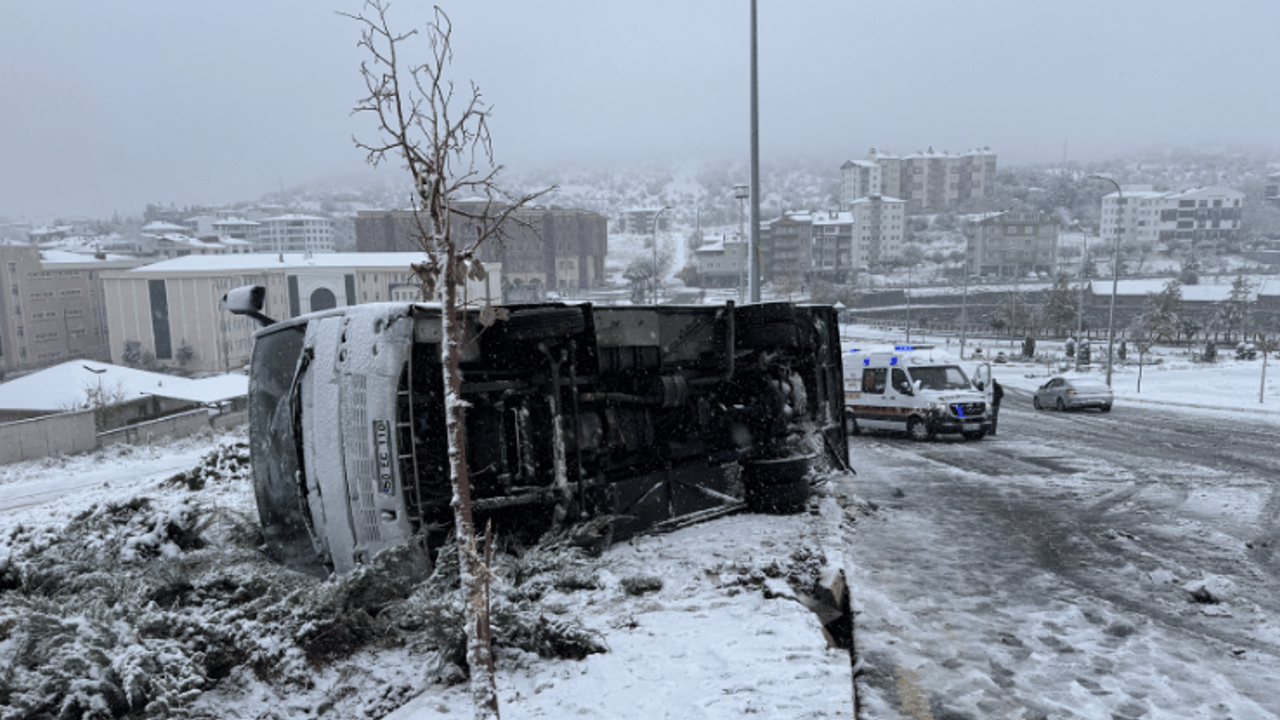 Abdullah Ağmanalmaz idaresindeki 50 EC 110 plakalı minibüs, Yavuz Sultan Selim Mahallesi Kayaşehir yolunda, kar yağışının ardından kayganlaşan yolda refüje çarparak devrildi.