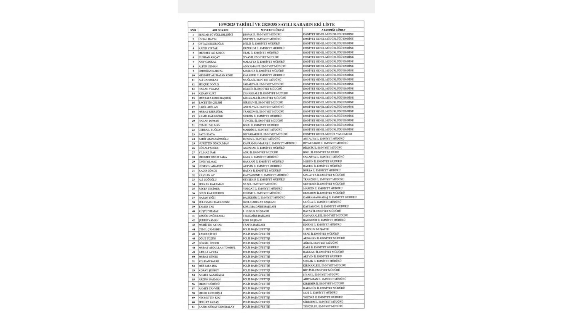 "Bursa Emniyet Müdürü Sabit Akın Zaimoğlu Antalya Emniyet Müdürlüğüne, Kahramanmaraş Emniyet Müdürü Nurettin Gökduman Diyarbakır Emniyet Müdürlüğüne, Ardahan Emniyet Müdürü Gökalp Şener Bilecik Emniyet Müdürlüğüne, Ağrı Emniyet Müdürü Yılmaz İpar Bolu Emniyet Müdürlüğüne, Kars Emniyet Müdürü Mehmet Ömür Saka Sakarya Emniyet Müdürlüğüne, Hakkari Emniyet Müdürü İdris Yılmaz Mersin Emniyet Müdürlüğüne, Artvin Emniyet Müdürü Hüseyin Adatepe Bartın Emniyet Müdürlüğüne, Hatay Emniyet Müdürü Kadir Gökce Bursa Emniyet Müdürlüğüne, Kastamonu Emniyet Müdürü Kayhan Ay Malatya Emniyet Müdürlüğüne, Nevşehir Emniyet Müdürü Ali Loğoğlu Trabzon Emniyet Müdürlüğüne, Muş Emniyet Müdürü Serkan Karaman Nevşehir Emniyet Müdürlüğüne, Yozgat Emniyet Müdürü Recep Tecimer Mardin Emniyet Müdürlüğüne, Edirne Emniyet Müdürü Onur Karaburun Erzurum Emniyet Müdürlüğüne, Balıkesir Emniyet Müdürü Hasan Yiğit Kahramanmaraş Emniyet Müdürlüğüne, Özel Harekat Başkanı Süleyman Karadeniz Muğla Emniyet Müdürlüğüne, Koruma Daire Başkanı Tamer Taş Kastamonu Emniyet Müdürlüğüne, 1. Hukuk Müşaviri Rüştü Yılmaz Hatay Emniyet Müdürlüğüne, TEM Daire Başkanı Ergün Dağıstanlı Çanakkale Emniyet Müdürlüğüne, KOM Başkanı Şükrü Yaman Balıkesir Emniyet Müdürlüğüne, Trafik Başkanı Muhittin Ayhan Edirne Emniyet Müdürlüğüne, Polis Başmüfettişi Taner Çiftçi Uşak Emniyet Müdürlüğüne, Polis Başmüfettişi Oğuz Tüzün Ardahan Emniyet Müdürlüğüne, Polis Başmüfettişi Göksel Önder Ağrı Emniyet Müdürlüğüne, Polis Başmüfettişi Murat Abdullah Tombul Kars Emniyet Müdürlüğüne, Polis Başmüfettişi Atilla Ayata Hakkari Emniyet Müdürlüğüne, Polis Başmüfettişi Murat Güneş Artvin Emniyet Müdürlüğüne, Polis Başmüfettişi Volkan Sazak Şırnak Emniyet Müdürlüğüne, Polis Başmüfettişi Mustafa Işık Kırıkkale Emniyet Müdürlüğüne, Polis Başmüfettişi Koray Şensoy Bitlis Emniyet Müdürlüğüne, Polis Başmüfettişi Ahmet Alaağaçlı Sivas Emniyet Müdürlüğüne, Polis Başmüfettişi Arzum Nazman Adıyaman Emniyet Müdürlüğüne, Polis Başmüfettişi Mesut Görücü Kırşehir Emniyet Müdürlüğüne, Polis Başmüfettişi Ahmet Canver Karabük Emniyet Müdürlüğüne, Polis Başmüfettişi Melih Kuzudişli Muş Emniyet Müdürlüğüne, Polis Başmüfettişi Necmettin Koç Yozgat Emniyet Müdürlüğüne, Polis Başmüfettişi Ferhat Akbaş Giresun Emniyet Müdürlüğüne, Polis Başmüfettişi Kazım Günay Demiralay Tunceli Emniyet Müdürlüğüne atandı."