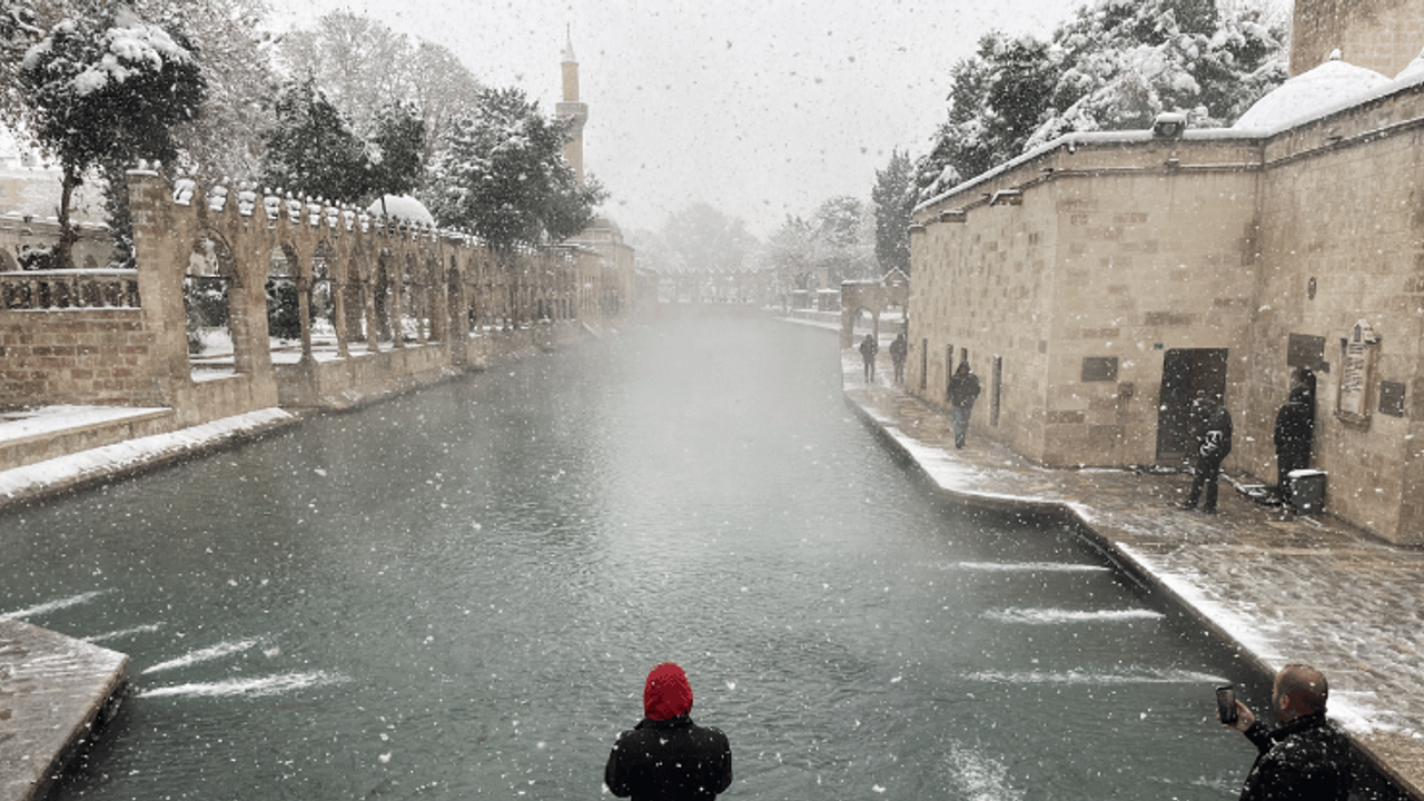 Kentte gece saatlerinde başlayan kar yağışı, tarihi Balıklıgöl ve Şanlıurfa Kalesi'ni beyaza bürüdü.