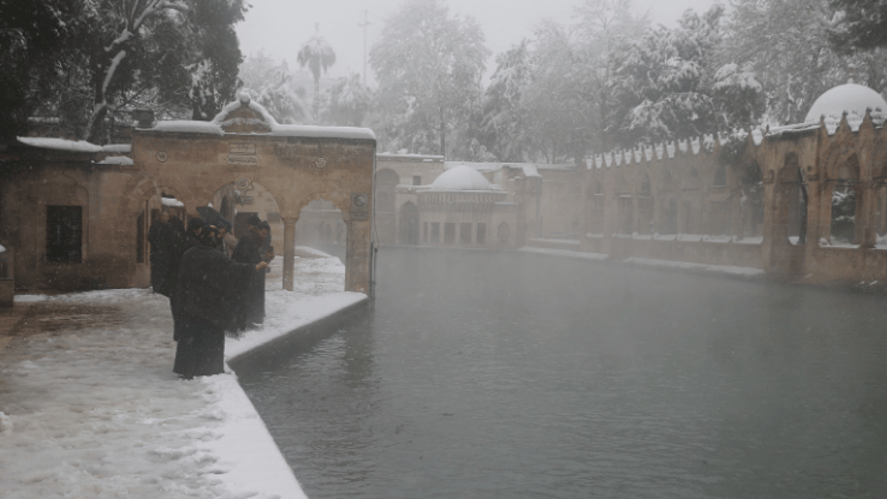 Kentte dün başlayan kar yağışı, tarihi Balıklıgöl ve Şanlıurfa Kalesi'ni de beyaza bürüdü.