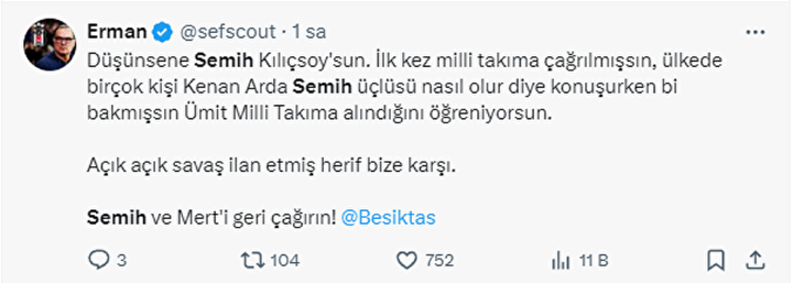 Beşiktaş forması giyen Semih Kılıçsoy'un kadrodan çıkarılması siyah-beyazlı taraftarlar ve yönetim tarafından tepkiyle karşılandı.