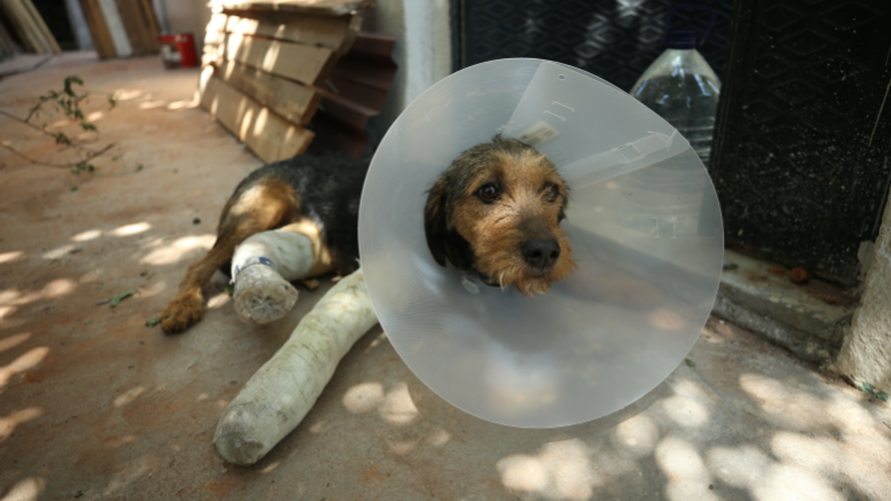 Merkez üssü Balıkesir'in Sındırgı ilçesi önceki gün meydana gelen 6,1 büyüklüğündeki depremde, Camikebir Mahallesi'deki bir evden düşen moloz nedeniyle iki bacağı kırılan "Ateş", tedavi için sahibi Bekir Doyuran tarafından Balıkesir Üniversitesi Veterinerlik Fakültesine götürüldü.