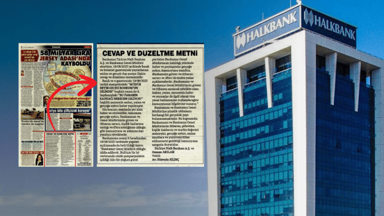 “Bankamız Türkiye Halk Bankası A.Ş. ve Bankamız Genel Müdürü aleyhine, 18 Ağustos 2025 tarihinde basılı ve internet gazetenizde yayımlanan asılsız ve gerçek dışı yazıya ilişkin cevap ve düzeltme metnimizdir: Basılı ve e-gazetenizin 18 Ağustos 2025 tarihli manşetindeki "MÜDÜR BEYİN GECESİ BODRUM'UN DİLİNDE!" başlıklı yazısı ile 8. Sayfasındaki "BU PARANIN KAYNAĞI NEREDEN GELİYOR?" başlıklı yazısında asılsız, yalan ve gerçeğe aykırı haber yapılmıştır. Söz konusu yazılarda yer alan haber ve söylentiler, tamamen gerçeğe aykırı, Bankamızın ve Genel Müdürünün güven ve itibarını sarsıcı, kişilik haklarına saldığı ve iftira niteliğinde olduğu gibi kamuoyunu ve yatırımcıları yanıltıcı niteliktedir.