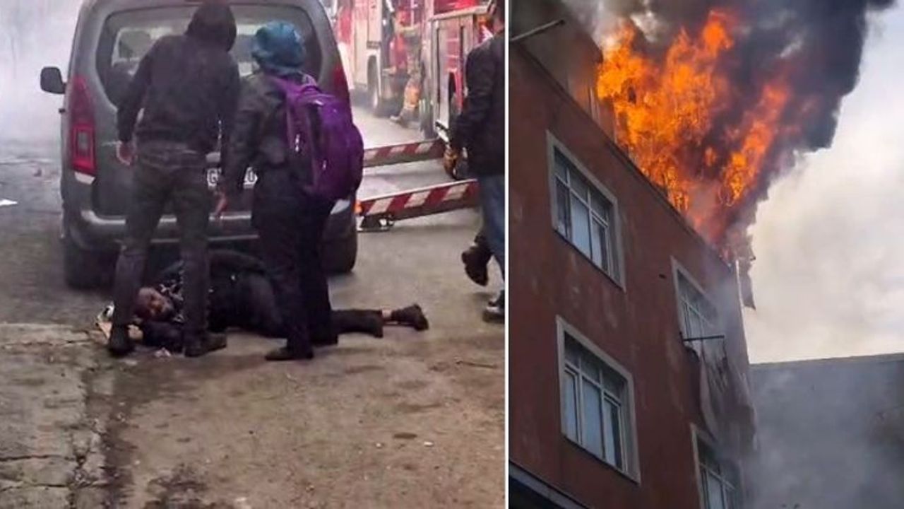 5'inci katta yaşayan yabancı uyruklu bir ailenin yaşadığı öğrenilirken, o sırada içeride olan bir kişi camı kırarak aşağı atladı. Eşinin aşağı atladığı gören kadın, hemen aşağı indi. Yaralanan eşinin yerde acılar içinde kıvrandığını gören kadın gözyaşlarına boğuldu. Yaralı adam olay yerinde yapılan ilk müdahalenin ardından ambulansla hastaneye kaldırılırken, yangın itfaiye ekiplerinin çalışmalarıyla söndürüldü. Soğutma çalışmaları sürerken, itfaiye ekiplerinin yangını söndürme çalışmaları dron ile görüntülendi.