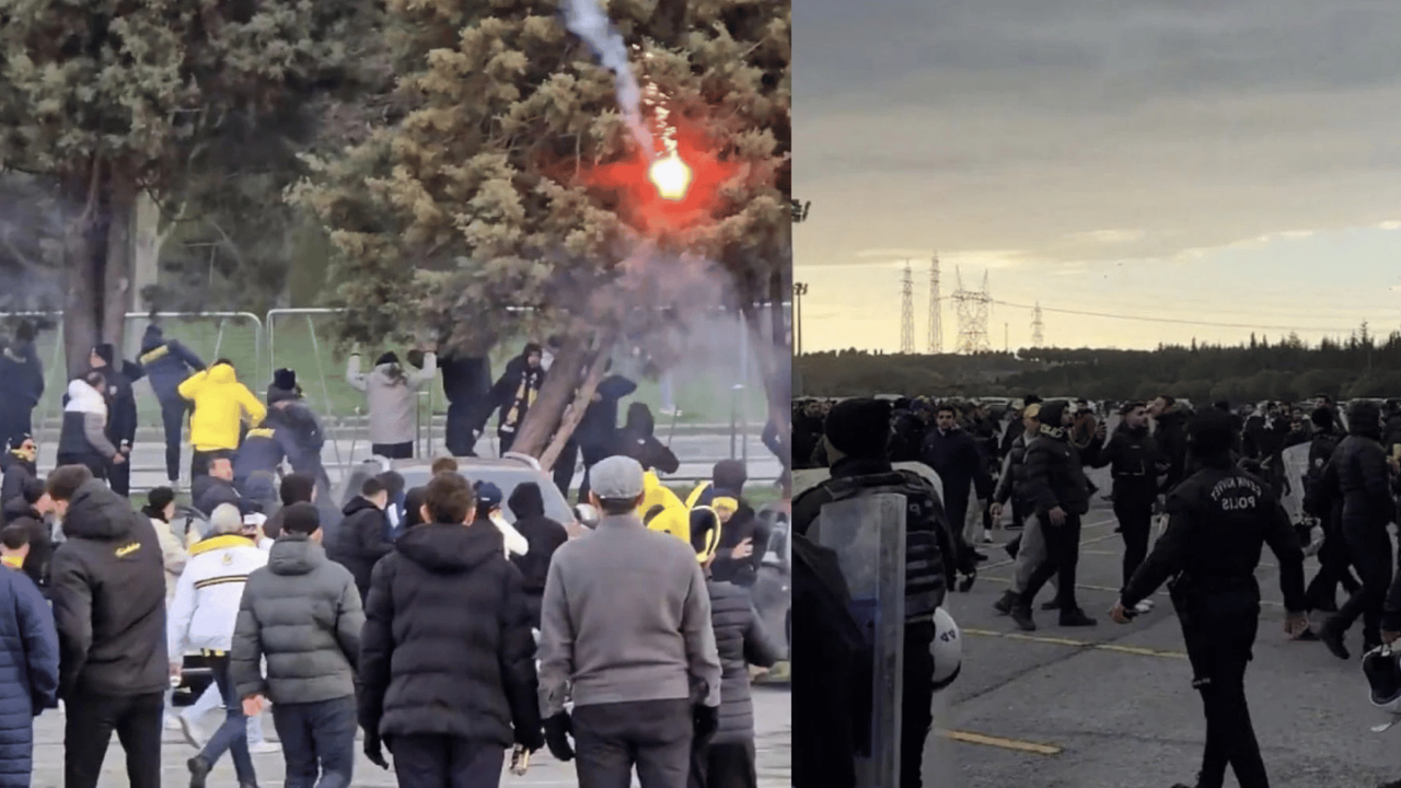 Sosyal medyaya yansıyan görüntülerde Fenerbahçeli ve Galatasaraylı taraftar arasında kavga çıktığı görüldü.