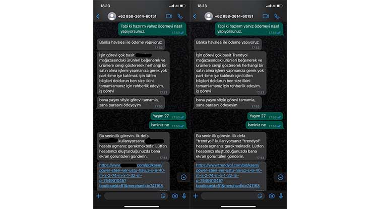 Bir kullanıcıyı tuzağa düşürmeye çalışan telefon dolandırıcısı, kendisini büyük bir e-ticaret kurumunda işe alım uzmanı olarak gösterdi. Kurbanına yarı zamanlı işten para kazanabileceğini söyleyerek ona görev karşılığında ödeme yapacağını ifade etti. Numaranın dolandırıcı olduğunu anlayan kurban ise tuzağa düşmekten son anda kurtuldu.