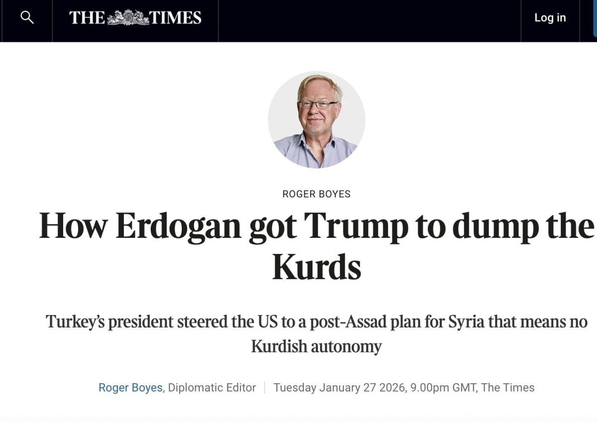 40 yıla yakın süredir kurumda çalışan Britanyalı gazeteci Roger Boyes tarafından kaleme alınan analiz, "Erdoğan, Trump'ı Kürtlerden vazgeçmeye nasıl ikna etti" başlığıyla yayınladı.