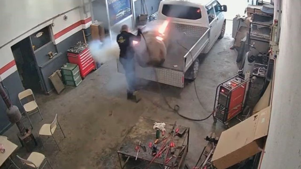 Patlama anı saniye saniye iş yerinin güvenlik kamerasına yansıdı. Görüntülülerde; ustanın kaynak yapması, bir anda alev alıp patlama anı ve sonrasında yaşanan panik yer alıyor.
