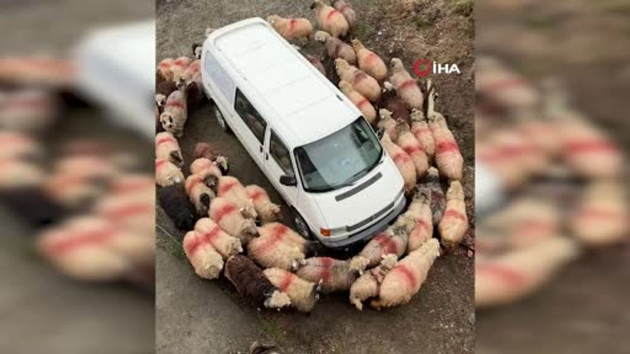 Trabzon'da renkli görüntüler: Koyunlar dakikalarca araç etrafında döndü