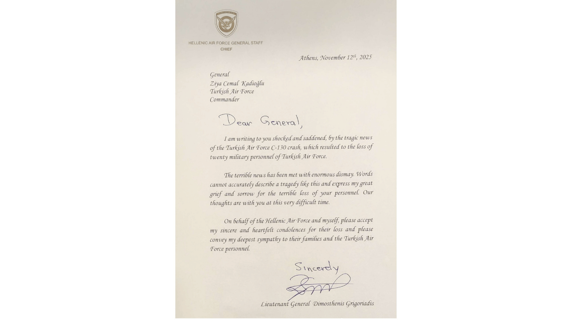 Mesajda, "Sayın General, Türk Hava Kuvvetleri'ne ait C-130 tipi uçağın düşmesi sonucu 20 Türk Hava Kuvvetleri askerinin hayatını kaybetmesiyle sonuçlanan trajik haberi duydum. Şok ve üzüntü içinde size yazıyorum. Bu korkunç haber büyük bir üzüntüyle karşılandı. Kelimeler böyle bir trajediyi tam olarak anlatamaz ve personelinizi kaybetmenin verdiği büyük acıyı ve üzüntüyü ifade edemez. Bu zor zamanda düşüncelerimiz sizinle. Yunan Hava Kuvvetleri ve şahsım adına, lütfen içten ve samimi taziyelerimi kabul edin, ailelere ve Türk Hava Kuvvetleri personeline en derin taziyelerimi iletin" ifadeleri yer aldı.